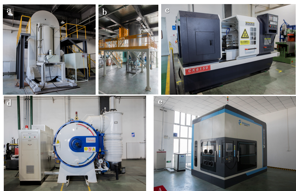 a)冷等静压机 b)等离子气雾化制粉 c)数控车床 d)真空气淬炉e)3D打印设备