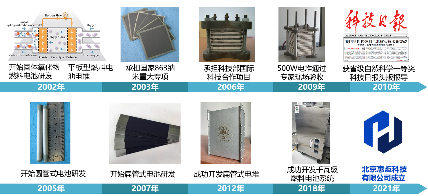 核心团队从2000年开始致力于SOFC关键材料及系统集成研究,2018年成功开发了千瓦级燃料电池系统并实现连续稳定运行,经过二十一年的持续攻关,在千瓦级SOFC发电系统量产化取得了突破性成就,完成了千瓦级SOFC量产准备。