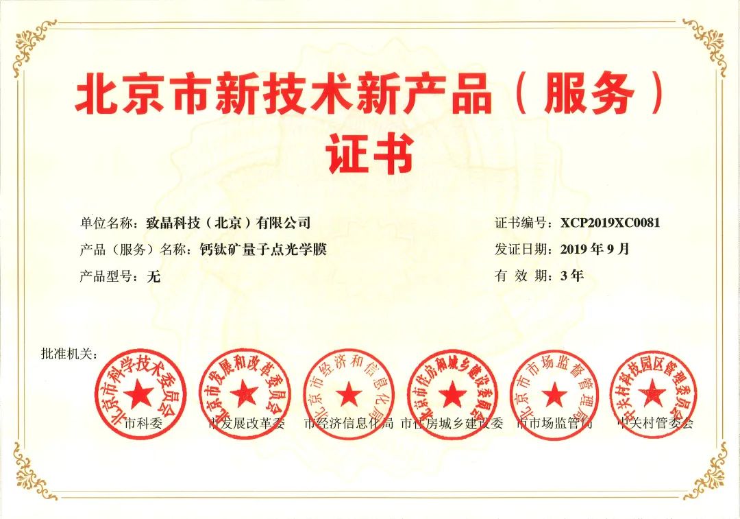 致晶重视产学研结合,崇尚创新,以原创的颠覆性“钙钛矿量子点原位制备技术”为起始,布局了钙钛矿量子点在OLED / Micro-LED显示色转换、太阳能电池、紫外增强、多光谱探测成像、微型激光器、图像传感等多个领域的应用,形成了一个以钙钛矿量子点为核心的创新体系。公司崇尚创新,重视知识产权布局,拥有国内发明专利5项,国际发明专利1项,并已申请国内专利140余项、国际专利12项。