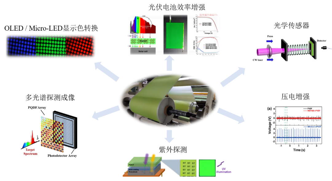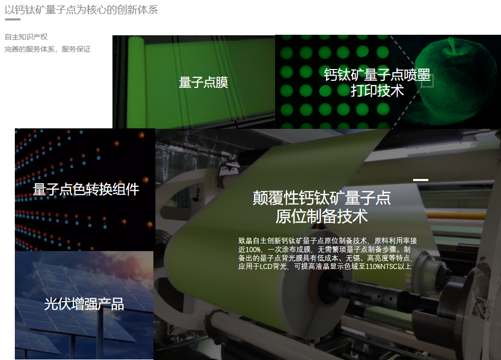 与传统量子点光学膜相比,钙钛矿量子点光学膜采用了全新的生产工艺,避免了量子点合成和清洗工艺中存在的诸多问题,原材料利用率接近100%,有效减少生产步骤,降低生产成本。同时,钙钛矿量子点的无镉特性可满足欧盟RoHS环保标准,且具有明显成本优势,是下一代量子点显示技术的首选体系。致晶重视产学研结合,崇尚创新,以原创的颠覆性“钙钛矿量子点原位制备技术”为起始,布局了钙钛矿量子点在OLED/Micro-LED显示色转换、太阳能电池、转光农膜、紫外增强、多光谱探测成像、微型激光器、图像传感等多个领域的应用,形成了一个以钙钛矿量子点为核心的创新体系。
