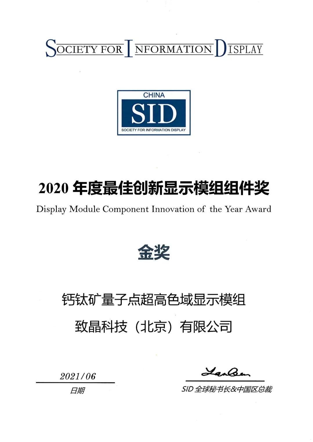 公司一路走来荣获多个重要奖项:2016年获得北京市科技新星计划路演推介会优秀项目奖和最具产业化前景奖;2017年获得北京市纳米之星创业大赛二等奖、“最具投资价值奖”;2018年获得全球科技创新暨博士后创业大赛二等奖、第七届中国创新创业大赛国际第三代半导体专业赛全球总决赛优胜奖;2019年获得中关村前沿技术创新大赛智能制造和新材料TOP10;公司的创新能力获得政府部门认可,2019年获批中关村高新技术企业、国家高新技术企业、国家“专精特新”企业,并承担中关村颠覆性技术研发及成果产业化项目;2020年获评为高聚人才企业,获中关村金种子企业,Perovskite-info报道致晶与TCL合作量产的500台,确认致晶为钙钛矿商业化全球第一的事实;获评SID年度最佳创新显示组件银奖、视听健康-技术创新奖、视听健康-体验创新奖;海高赛、新高赛三等奖;北京创新创业大赛季成长组三等奖;2021年SID年度最佳创新显示模组组件金奖,湾高赛TOP50奖等。