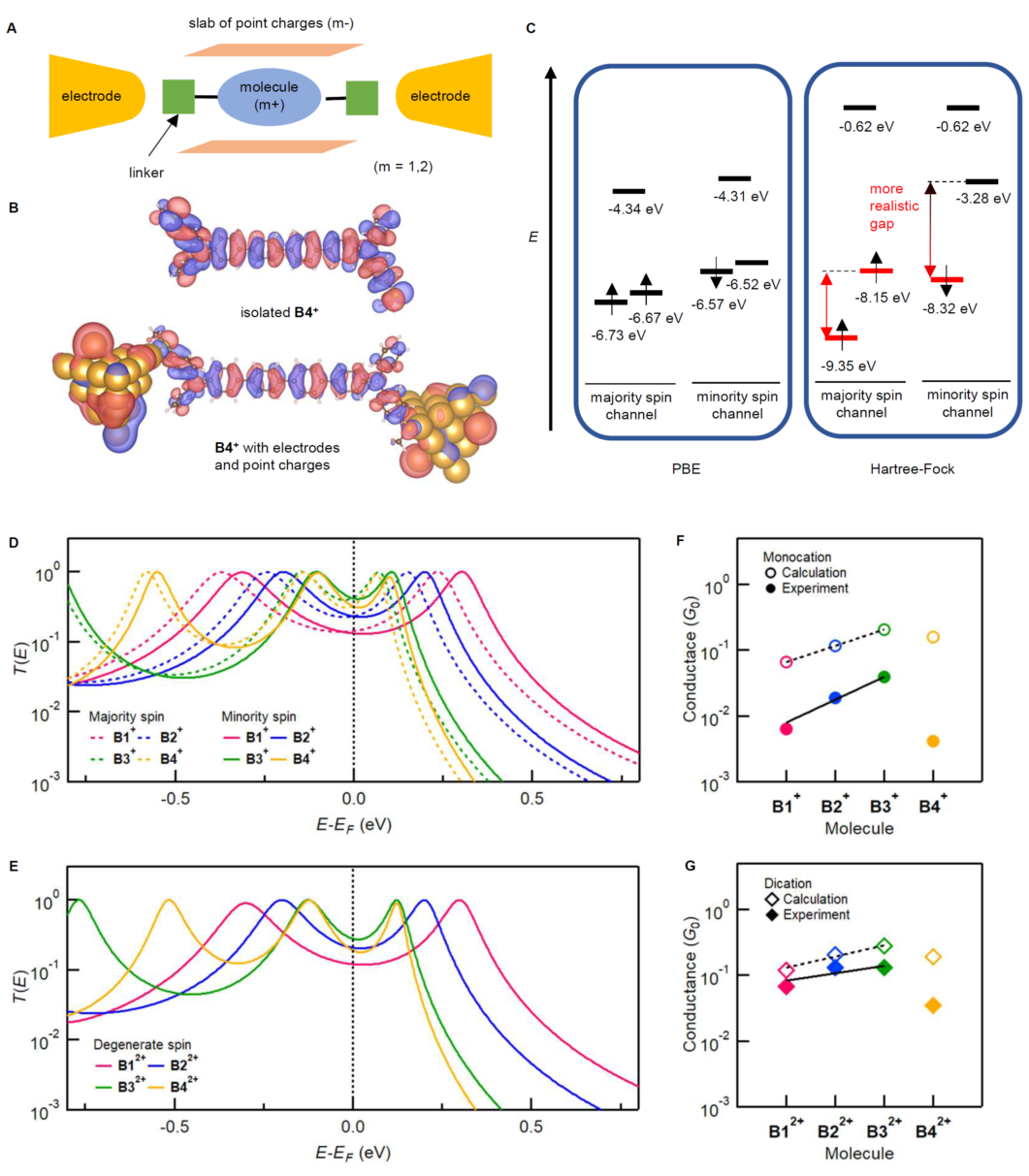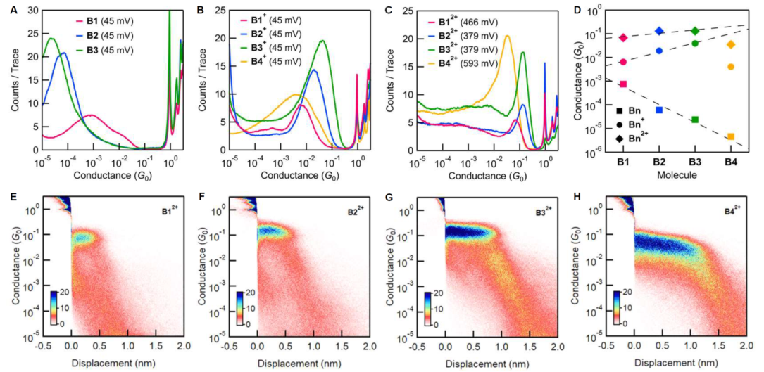研究人员基于STM-BJ测试平台系统研究了该类分子导线在不同氧化态的单分子电导性质。其中,B32+分子导线显示出明显高于 0.1 G0 (2e2/h, 电导量子)的超高电导率,相比其中性分子高 5400 倍,且分子导线长度达到2.6 nm。研究人员也观察到氧化后的阳离子型分子导线呈现电导与导线长度的负相关特征,分别为b(B1-3+)=""-0.9/苯;b(B1-32+)=-0.3/苯,表明该类分子导线具有SSH模型描述的一维拓扑绝缘体特征。此外,研究人员也观察到了B4分子导线在氧化之后并没有延续前三个分子导线的电导趋势,而是表现出了明显的下降,这也说明了基于SSH模型的分子导线电导性质与长度有较强的相关性。