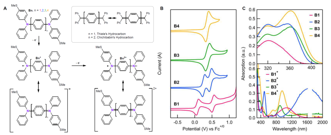 图1 含低聚苯桥的双(三芳基胺)分子导线(B1-B4),及其电化学和光谱性质