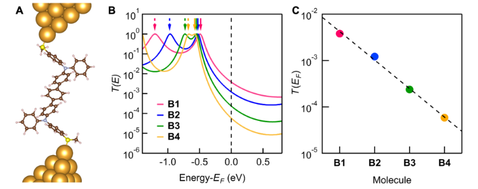 bv伟德国际1946官网化学与化工学院的尹晓东特别研究员一直以来对于具有氧化还原活性的有机分子在单分子电子学上的性质和应用有着浓厚的兴趣。在美国进行博士后研究期间就与美国哥伦比亚大学 (Columbia University) 的Latha Venkataraman教授和Luis M. Campos教授合作发表关于氧化还原调控分子芳香性从而导致电导大幅增加的研究成果 ( Science Advances, 2017, 3 : eaao2615)。而在本工作中,尹晓东特别研究员与Venkataraman教授,Luis M. Campos教授以及德国雷根斯堡大学 (University of Regensburg) Ferdinand Evers教授等人开展合作,系统研究了一系列含有低聚苯桥的双(三芳基胺)分子导线在电中性,一价和二价阳离子状态的单分子电学性质。相关工作于近期发表在化学类国际顶级期刊Nature Chemistry上( Nat. Chem. 2022,10.1038/s41557-022-00978-1)。