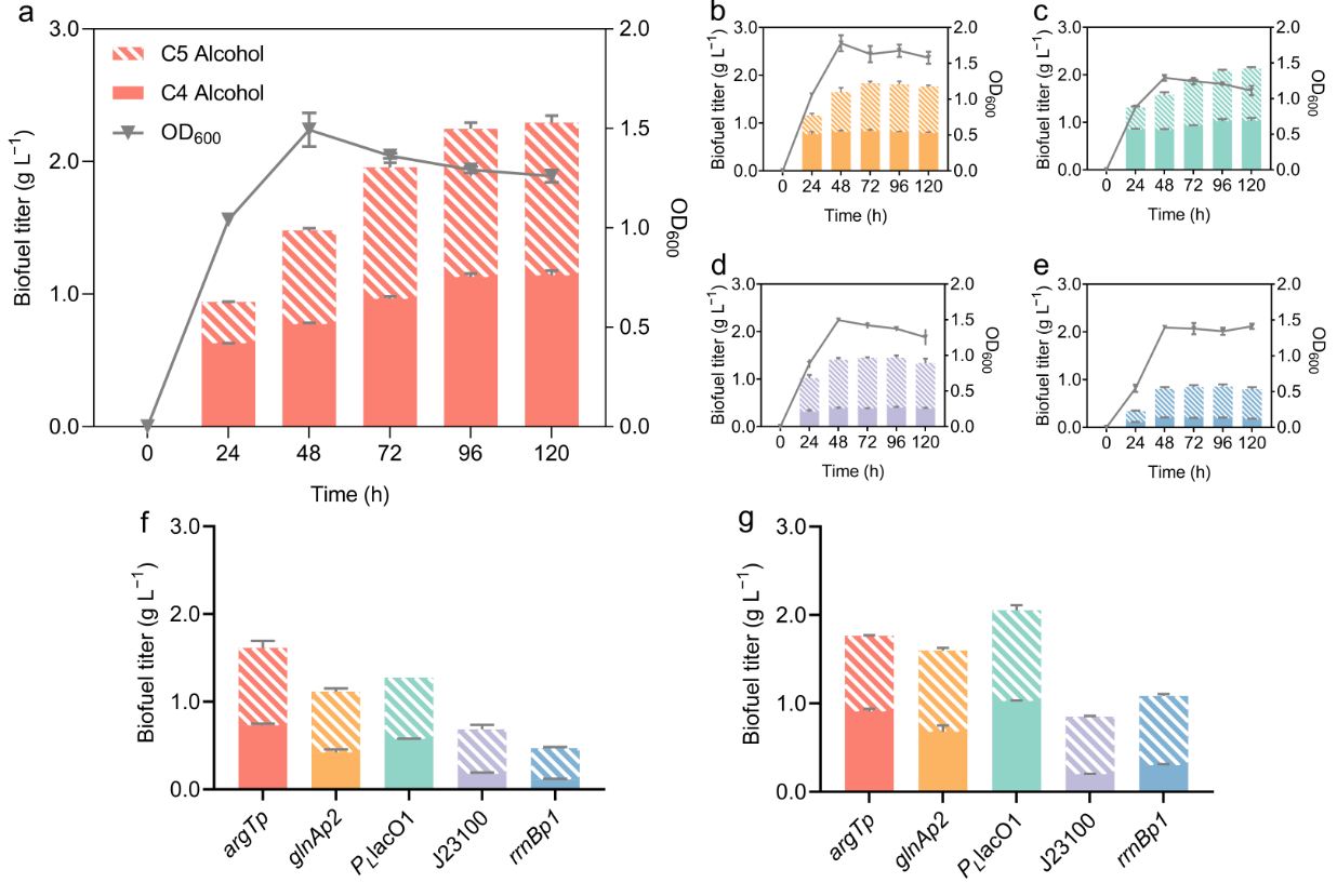 本文第一作者马晓焉副研究员和博士研究生马炼杰聚焦利用转录调控手段提升细胞工厂鲁棒性的研究,取得了一系列的研究进展。在全局调控层面,建立了σ54型RNA聚合酶驱动的合成途径持续表达系统,解决了σ70型全酶在生长稳定期和胁迫条件下的供应不足问题,实现了合成途径的自响应、自激活和自强化,对低pH、高渗透压等胁迫条件表现出较好的抵御能力,成功实现了跨越整个生长期和胁迫条件下的高效生物合成。以σ54依赖型启动子驱动高级醇的生物合成,高级醇产能在进入菌体生长稳定期后持续加强,产量达到常用σ70依赖型启动子的3倍( Biotechnol Biofuels . 2020, 13:29)。