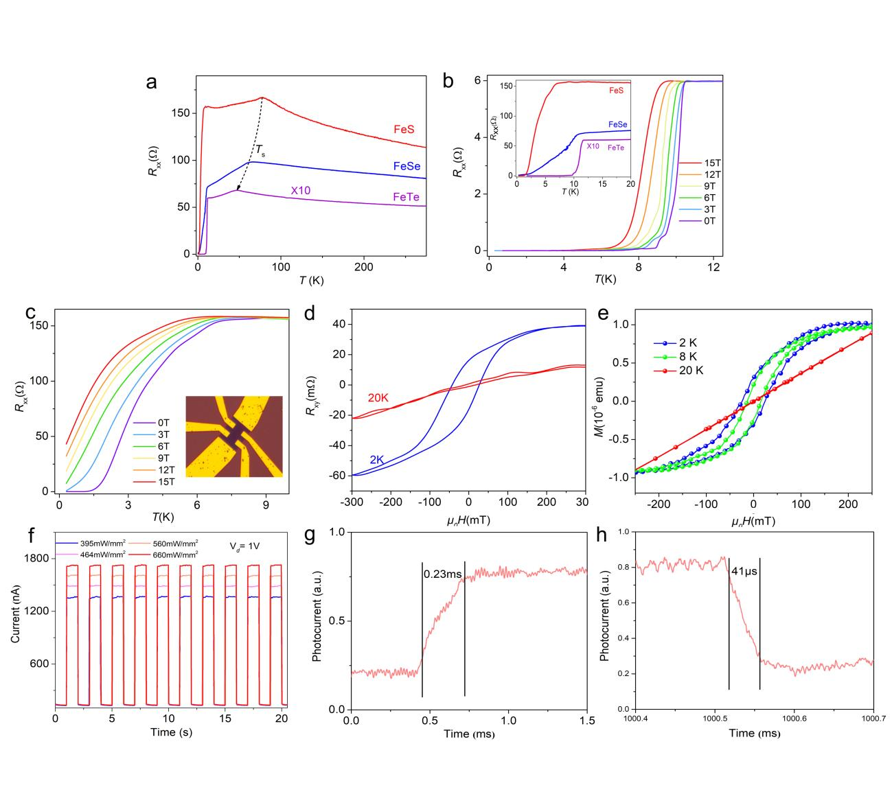 更重要的,这些二维材料展现出新奇的物理特性,使其成为基础研究和实际应用的新兴平台。研究表明,四方相FeX表现出超导特性。FeS、FeSe和FeTe的超导转变温度Tc值分别为3.3、7.3和11.0 K。不同于FeX,FeX2(FeS2)表现为铁磁特性,其Tc值约为15 K。此外,FeTe2红外探测器响应速度优于大多数已报道的二维材料。这说明所合成不同组成的二维材料具有较高质量,为进一步研究物理性能和构建异质结构如铁磁/超导结等提供了平台。