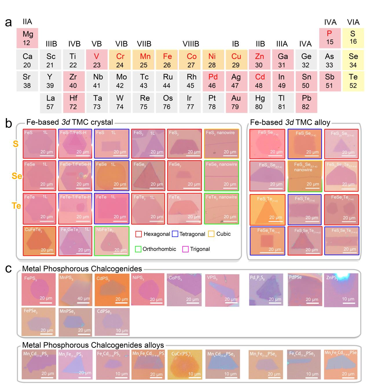 鉴于以上问题,bv伟德国际1946官网周家东、王业亮、姚裕贵教授团队和南洋理工大学刘政教授等首次联合提出了竞争反应动力学的生长机制,通过控制温度和蒸气压,实现了对化学气相沉积过程单一相的成核和生长速率的控制,进而实现了67种包括不同组分/不同相的(MX、MX2、MPX和MPX3)TMCs和TMPCs及其合金与异质结的可控制备。重要的是,Fe基组成和相工程的实现为研究Fe基自旋电子学,以及基于Fe基超导体的马约拉纳零能模等开辟了新的可能。磷硫化合物的首次CVD直接制备为进一步研究其反铁磁特性及器件提供了材料基础。这是继2018年开发的二维材料库的普适性生长方法(Nature 556, 355 (2018))后的又一普适性制备策略。相关成果以 “Composition and phase engineering of metal chalcogenides and phosphorous chalcogenides”于 6月23日发表于国际顶尖学术期刊《Nature Materials》。