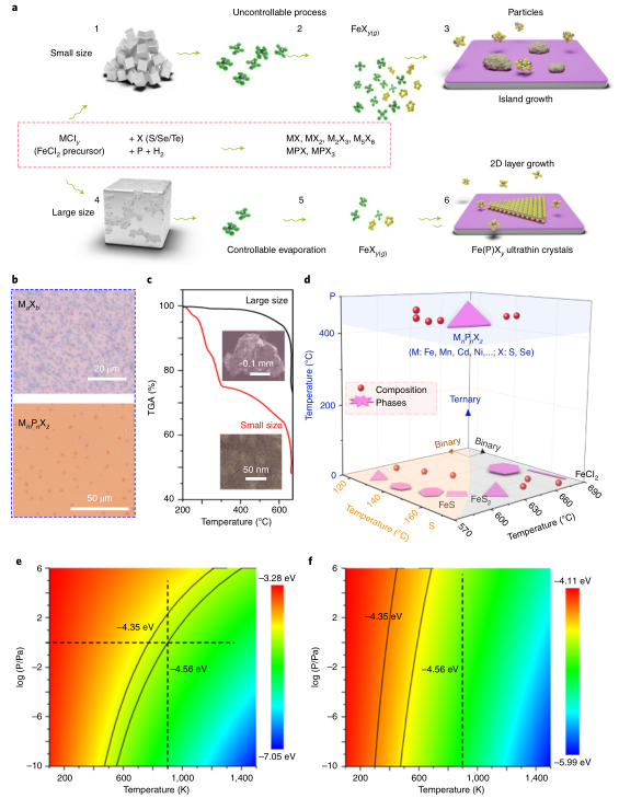 具体内容如下:以Fe基化合物的制备为例,Fe基的硫族二元化合物常见的包括FeX和FeX2,而FeX和FeX2又包括四方相和六方相等;三元磷硫化合物同样包括不同的组成如MPX,MPX3等。在成核生长过程中,不同组成和不同相之间相互竞争。同时,三元MmPnXz的生长过程更加复杂,其化学反应包括二元反应(MaXb 、McPd 和 PX)和三元反应,MmPnXz 的制备不仅需要控制三元成分生长的反应,同时需要避免形成二元MaXb,PX和McPd。另外,一些MaXb和MmPnXz具有非层状结构,非层状的外延生长和岛状生长模式之间还会相互竞争,为获得原子层厚度的二维材料,需要控制反应按照外延生长模式进行。