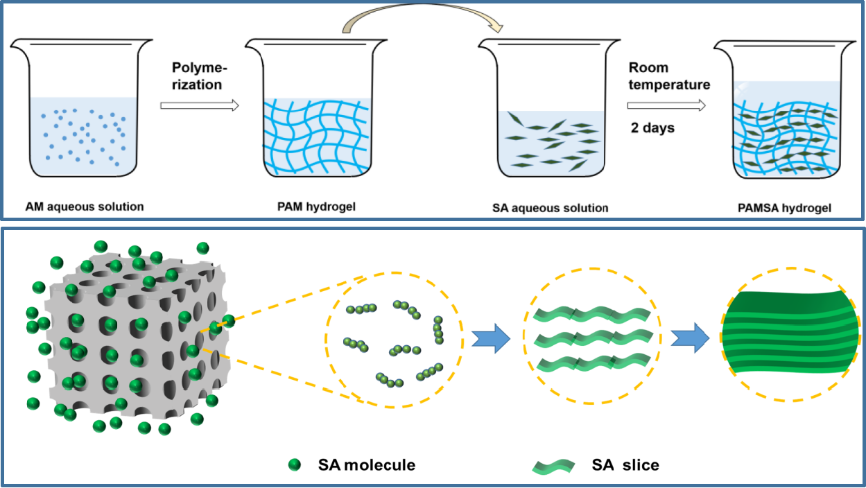 海藻酸盐水凝胶是一种具有3D多孔网络结构的软材料,其在生物医学、光、电、载体等许多领域有着广泛的应用。但是,海藻酸盐水凝胶大多力学强度较低,使用过程易发生机械损伤且损伤后性能大大降低,无法继续满足使用要求。因此,发展并制备具有自愈合性能且具有高强度的水凝胶多功能材料具有十分重要的意义。