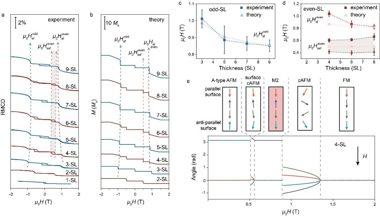 在反铁磁相研究中(图2),1~9层样品呈现典型的A型反铁磁行为,体现出明显的奇偶层数震荡效应。在奇数层中,样品因未补偿的一层净磁矩在零场附近出现迟滞回线,并随磁场增加,除1层样品外均经历一次“自旋-翻转”(spin-flop)过程,最后达到磁饱和态。而在偶数层中,因不再有未补偿的净磁矩,零场附近迟滞回线消失;在大于2层的样品中,随着磁场增大,会先经历一次表面“自旋-翻转”过程,达到一个共线的M2态(磁矩为2层MnSb2Te4的静磁矩),也就是磁矩与外磁场反平行的表面层磁矩从与磁场反平行翻转到了与磁场平行,之后,再经历体“自旋-翻转”过程,最后达到磁饱和态。联合研究团队通过一维线性链模型拟合实验数据,获得材料的各向异性能和层间相互作用能,从理论上得到了不同层数反铁磁样品的磁演化过程。并发现反铁磁相MnSb2Te4的各项异性能与相互作用能的比值略大于MnBi2Te4中的该比值,解释了在MnBi2Te4中没有观测到稳定M2态的原因,由此也为研究共线M2态下的量子输运性质研究提供了一个材料体系。