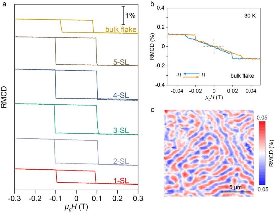 在铁磁相研究中(图3),少层样品的磁演化与层数之间没有明显的依赖关系。相比于厚层样品,在少层样品中观察到更大的矫顽场,这可能是由磁各向异性能变大以及屏蔽作用的减小引起的。较大的各向异性能使得少层样品在低于居里温度的整个测量温度范围内一直保持单畴的行为;厚层样品随着温度升高,单畴行为难以保持,会出现明显的迷宫畴,在零场下测得畴的尺寸约为625 nm。