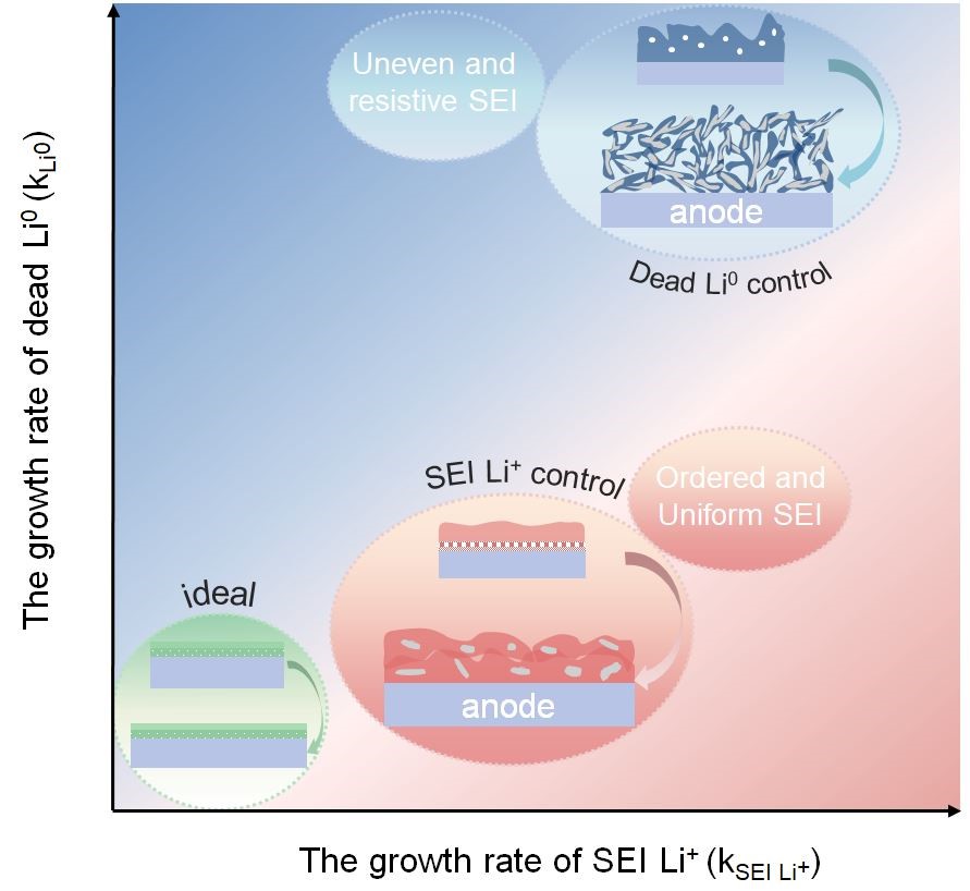 图3 不同的SEI Li+和dead Li0增长速率(kSEI Li+, kLi0)与金属锂负极的界面演化相关性的示意图。蓝色区域的非活性锂为死锂控制,其中kLi0/kSEI Li+>1;红色区域的非活性锂为SEI Li+控制,其中kLi0/kSEI Li+<1。