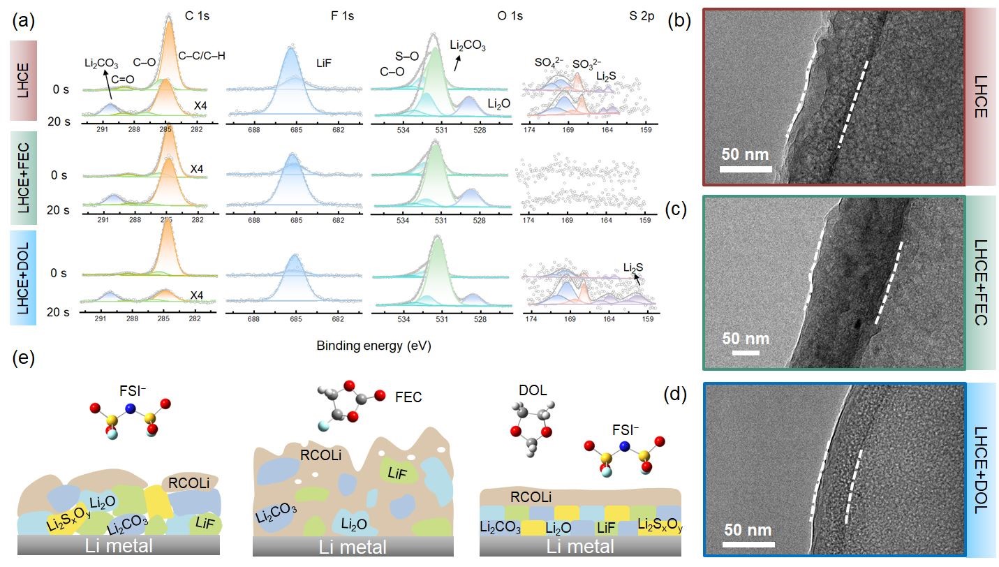 不同的SEI化学/结构特性直接影响锂沉积/脱除行为和SEI的动态重构过程,进而产生不同dead Li0和SEI Li+增长速率。系统性的研究表明,1,3-二氧环烷(DOL)介导了均匀有序层状SEI的产生,有助于提高锂金属沉积的均匀性以及SEI的循环稳定性,同时降低SEI Li+和dead Li0的增长速率。