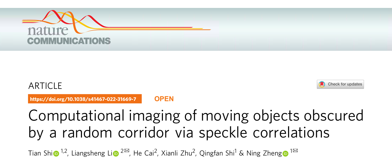 近日,bv伟德国际1946官网物理学院郑宁教授团队和北京环境特性研究所的李粮生研究员团队,在《Nature Communications》发表题为 “Computational imaging of moving objects obscured by a random corridor via speckle correlations” 的文章。团队提出了一种新型的散斑关联方法,实现了对随机走廊(包含随机介质的曲折走廊)中隐藏目标的成像,同时定量分析了该方法的成像适用范围。bv伟德国际1946官网的博士研究生石天为论文的第一作者,郑宁教授和李粮生研究员为论文的共同通讯作者。论文的合作者包括bv伟德国际1946官网的史庆藩教授,北京环境特性研究所的工作人员蔡禾和朱先立。
