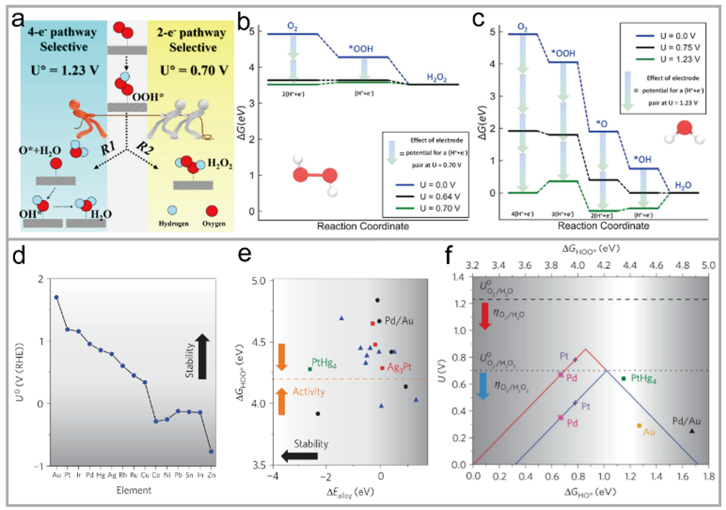 ORR过程分为两电子反应-生成OOH- /H2O2和四电子反应-生成OH-/H2O。这两种不同的反应途径之间存在明显的竞争。由于两电子过程只涉及到*OOH中间体,所以其机理显然是最简单的反应步骤。*OOH中间体(ΔG(*OOH))的结合自由能决定了催化活性和选择性。不同的化学中间体如*OOH、*O和*OH通过多种途径参与四电子过程,包括*OOH缔合、*OOH解离和轴端吸附途径。