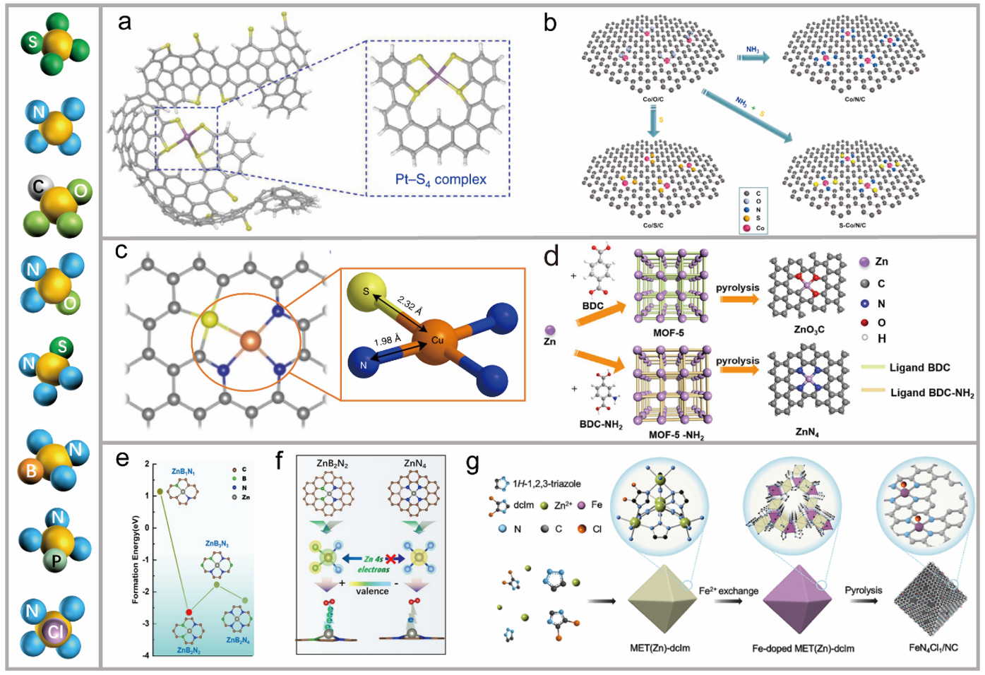 根据配位化学和晶体场理论,与中心活性金属直接配位的原子可以对整体催化位点产生特定而显著的作用。由于中心金属位通常配位4个原子(通常配位为d-p σ-键),其键能或局域电子结构由第一个配位原子决定。