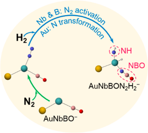 在国家自然科学基金委重大研究计划的支持下,我校化学与化工学院马嘉璧副教授团队在前期的研究基础上,实现了四元团簇AuNbBO−阴离子对N2和H2的有效活化,并生成亚氨基(*NH)单元为主、含少量氨基(*NH2)单元的产物AuNbBON2H2−。在这个反应中,Nb和B原子协同解离N2,Au原子作为还原剂促进转移活化的N原子,从而进行后续氢化过程;三中心二电子键的形成促进了N2活化和N转移。这一研究表明贵金属协同的前过渡金属硼化物团簇对于促进N−N键和H−H键的断裂有着较高的反应性,并且形成了N2氢化反应中重要的中间体,即*NH(或者*NH2)和*NBO单元。这些研究结果为设计用于N2和H2合成NH3的新型催化剂提供了新的思路。