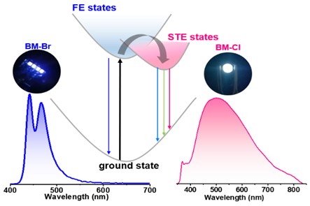 近年来,低维有机-无机杂化金属卤素钙钛矿开辟了单一组分白光荧光粉的新领域,研究表明其宽带白光发射是由自陷激子(self-trapped excitons, STEs)回到基态产生的,并依赖于影响材料电子-声子耦合强度的晶格扭曲程度和无机骨架与有机阳离子之间的相互作用。以往报道发现卤素取代可调控出低维钙钛矿晶体的STE宽峰白光发射,但其内在机制尚未清楚。该团队为了探究不同卤素对2D钙钛矿STE自陷态发光机制的影响,将质子化的苯并咪唑作为有机阳离子,分别以Br-和Cl-为卤素阴离子合成了两个100取向的二维钙钛矿单晶BM-Cl和 BM-Br。值得注意的是,虽然二者具有相似的晶体结构,并且晶体在无机八面体框架中几乎无扭曲,但是却展示出完全不同的发光特征和机制(图 1)。