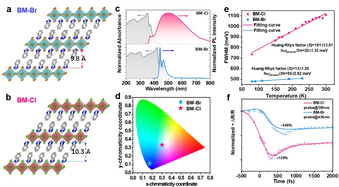 图2 BM-Cl和BM-Br的晶体结构以及光学特性谱图(光致荧光PL、色域值、Huang−Rhys因子计算和瞬态热激子弛豫)