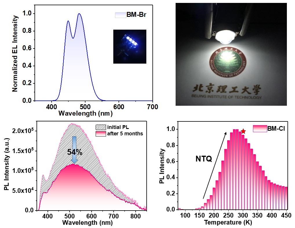 最后,该团队将两种二维钙钛矿单晶材料分别应用于电致发光二极管(LED)和光致发光器件。基于BM-Br发光层的LED器件发出明亮的深蓝光,其CIE颜色坐标为(0.159, 0.097),很好的对应了显示器深蓝指数的标准坐标;将BM-Cl荧光粉应用于光致发光器件,可发出明亮的宽带白光。此外,BM-Cl荧光粉还表现出一个负热猝灭(NTQ)范围,并且在室温300 K左右达到最大强度,在450 K之前热猝灭较弱。基于BM-Br发光层的深蓝光LED和基于BM-Cl的白光荧光粉都表现出优异的稳定性(图3),在显示照明领域有较大的应用潜力。