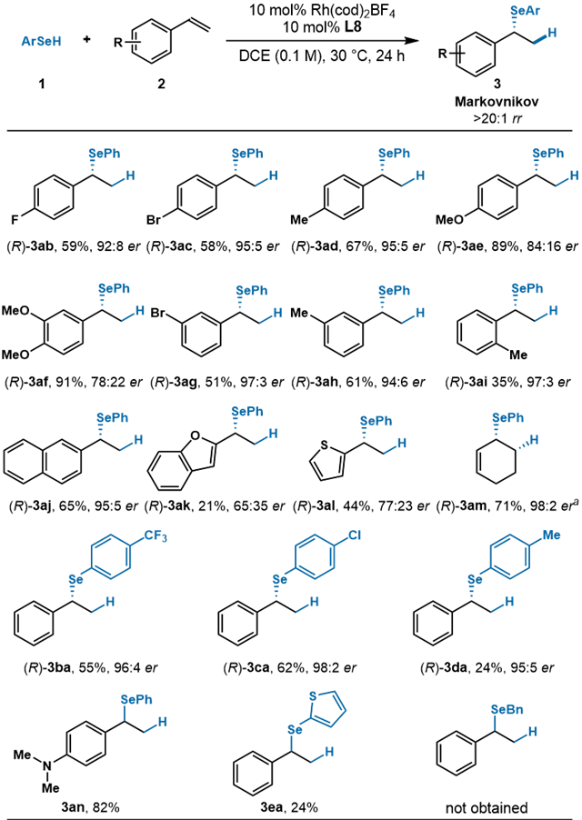 不同类型的烯烃可以给出很好的反应结果(图2)。例如:苯环上含有甲基、甲氧基和卤素取代的苯乙烯和萘乙烯都适用于该反应。此外,环己二烯的氢硒化反应性和对映选择性也很好。对于硒醇底物,苯环上含有三氟甲基、氯和甲基取代基的苯硒醇都具有较高的对映选择性,与具有给电子基团的硒醇相比,苯环上具有吸电子基团的硒醇表现出更高的反应性。