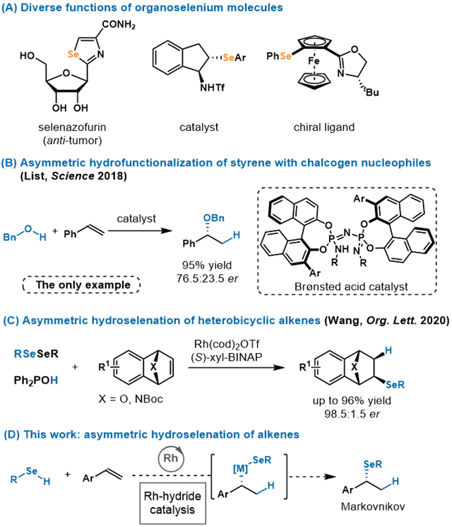 自1818年Berzelius发现硒以来,硒已被引入药物、催化剂和材料的设计中(图1A)。尽管硒是人类健康的基本元素,但与氧簇元素中的氧和硫相比,硒的反应研究仍然少得多,并且存在很多挑战。此外,烯烃的氢官能化反应可以从廉价易得的烯烃构建各种分子砌块,尽管是一种非常具有原子经济性的策略,但氧簇元素作为氢官能化中亲核试剂的研究很少。近日,杨小会教授课题组和Vy M. Dong教授课题组合作首次实现了Rh催化苯乙烯的不对称氢硒化反应(图1D)。