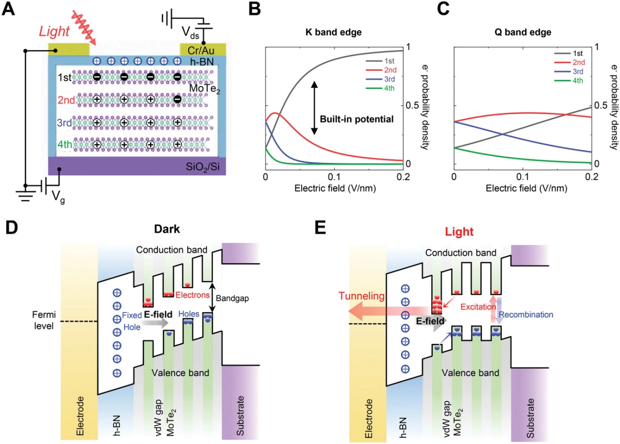 图1. 隧穿光电晶体管中MoTe2 K能带边缘的轨道栅控。(A)基于四层MoTe2和h-BN隧穿势垒的隧穿光电晶体管的示意图。(B&C)MoTe2 K能带边缘和Q能带边缘层相关的电子概率密度。(D&E)黑暗条件下和光照下隧穿光电晶体管的能带示意图。