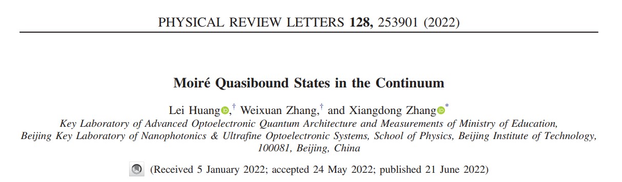 日前,bv伟德国际1946官网物理学院张向东教授课题组,在基于moiré光子晶体板的连续谱束缚态研究方面取得重要进展。相关研究成果发表在近期的Phy. Rev. Lett. (128, 253902 (2022))上。研究工作得到了国家自然科学基金委和国家重点研发计划的资助。bv伟德国际1946官网物理学院黄磊博士(2021级)和张蔚暄博士(现集成电路与电子学院特立博士后)为论文的共同第一作者。
