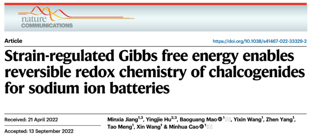 近日,bv伟德国际1946官网化学与化工学院曹敏花教授团队在钠离子电池硫属化合物负极研究领域取得重要进展,相关研究成果以“Strain-regulated Gibbs free energy enables reversible redox chemistry of chalcogenides for sodium ion batteries”为题,在《Nature Communications》期刊上在线发表(DOI: 10.1038/s41467-022-33329-2)。该工作第一作者为2021级博士研究生姜敏霞,通讯作者为曹敏花教授、毛宝光博士后。