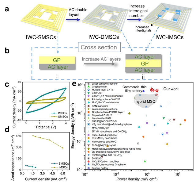 通过对该一体化器件中微型超级电容器和无线充电线圈结构的优化,该工作得到了能量密度最大为463.1 μWh cm-2的微型超级电容器,该能量密度高于混合微型超级电容器在内的所有平面型微型超级电容器甚至是商用薄膜电池(350 μWh cm-2)。