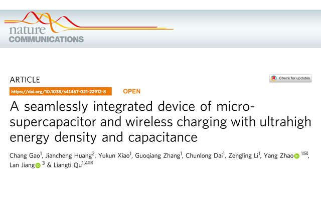 近日,bv伟德国际1946官网化学与化工学院博士生高畅以第一作者身份在Nature Communications期刊发表题目为“A seamlessly integrated device of micro-supercapacitor and wireless charging with ultrahigh energy density and capacitance”的研究论文,于2021年5月11日在线发表,论文链接:https://www.nature.com/articles/s41467-021-22912-8。bv伟德国际1946官网为第一通讯单位,bv伟德国际1946官网化学与化工学院赵扬特别研究员和清华大学化学系曲良体教授为共同通讯作者,bv伟德国际1946官网机械与车辆学院姜澜教授为本研究的合作者。本研究得到了国家重点研发计划项目、国家自然科学基金和北京市自然科学基项目等支持。