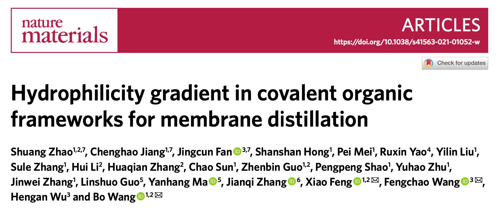 bv伟德国际1946官网的王博教授和冯霄教授团队以具有规整贯穿纳米孔道的二维共价有机框架(COF)薄膜为基础,通过引入竞争性可逆共价键合策略,实现了孔道大小和孔内亲疏水环境随深度梯度变化的COFs薄膜的制备。利用COF薄膜限域纳米孔道中水蒸发的增强效应,实现了超高通量膜蒸馏海水淡化,颠覆了对MD膜材料需要大孔径孔道的传统认知,为开发下一代高性能MD分离膜提供了理论支持。相关成果以“Hydrophilicity gradient in covalent organic frameworks for membrane distillation”为题,发表在《Nature Materials》上,该文通讯作者是冯霄、王奉超、王博;第一作者是赵爽、蒋成浩、范竞存;本文实验部分由北理工完成,中科大王奉超团队利用分子动力学模拟为实验结果提供了强有力的理论支撑。