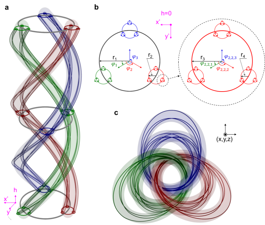 首先,研究人员理论设计了具有多拓扑不变量的嵌套式纽结结构。图1显示了构建嵌套式纽结的示意图。其中,图1a是该嵌套式纽结的辫子表示,它包含了由绿色、红色和蓝色标记的三类不同层级的零点线。为了更清楚地显示嵌套纽结的层级结构,图1b展示了起始端面的放大图。从中我们可以看到,半径为 r 1的第一代辫子由绿色、红色和蓝色标记的三条第二带辫子编织而成。同时,三条半径为 r 2的第二代辫子是由半径尺寸更小的第三代辫子编织而成。而半径为 r 3的第三代辫子是由半径为 r 4的第四代辫子编织而成。通过上述嵌套式的编织方式,最终具有分形几何结构的嵌套纽结可以被构建出来。如图1c所示,通过将图1a中辫子的起始端平面和终点端平面收尾相连,可以实现由四代辫子组成的嵌套纽结结构。由于这一新型的纽结结构具有分形式的嵌套结构,研究者称其为嵌套纽结(nested knots)。嵌套纽结这一概念的提出,是对纽结理论的拓展。