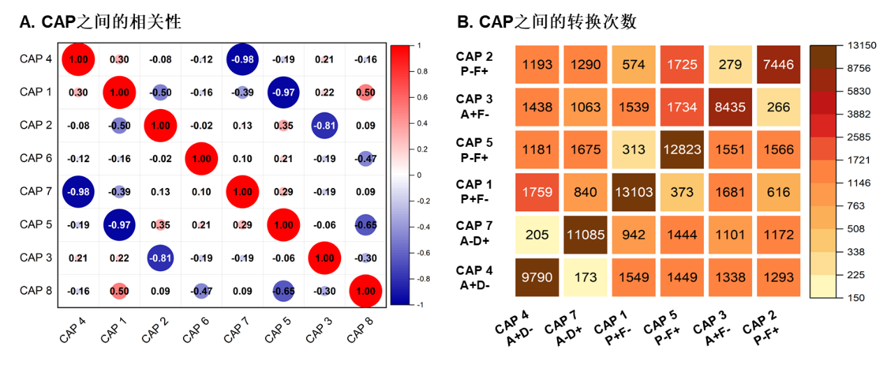 图2 不同激活模式(CAP)间的相关性和相互转换
