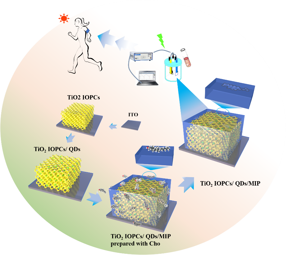 柔性可穿戴智能化健康监测装置离不开生物传感器技术的发展。光电化学(PEC)传感器具有成本低、仪器简单、易于小型化和高灵敏度的优势。有机/无机杂化和无机钙钛矿新型纳米材料因其具有载流子迁移率高、直接带隙结构、光电转换效率高等优异的光电性能,在多个领域备受关注。本课题组采用二氧化钛反蛋白石/钙钛矿量子点异质结,同时包裹高选择性分子印迹聚合物层的策略,不仅建立了能够应用于水溶液样品检测的钙钛矿生物传感器,而且实现了血样中胆固醇的高选择性检测(https://doi.org/10.1016/j.bios.2022.114112) (https://authors.elsevier.com/tracking/article/details.do?aid=132121&jid=SNB&surname=Lina)。在此工作基础上,本团队将进一步开展汗液中未知目标的检测,以建立新型可穿戴智能健康监控装置。
