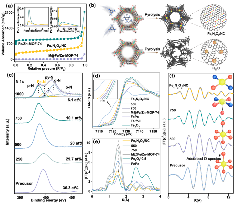 通过对引入N源和未引入N源等不同阶段的BET和形貌等进行分析,得出N源的引入不仅能够有助于形貌的维持,还有助于Fe单原子的形成。通过对引入N源的Fe/Zn-MOF-74进行不同温度下(0℃,250℃,500℃,750℃及1000℃)煅烧产物的XRD,XPS及同步辐射表征以研究催化剂结构的生成过程。Fe k边XANES光谱显示,不同温度下煅烧的样品均在1-2 Å处都有一个主要的峰,可以归因于第一壳层金属- N /O。随着反应温度的升高,峰强度降低,峰位略微向左偏移,说明局部配位数相应降低,形成了混合Fe-N/O的配位构型。进行定量EXAFS分析表明,热解前,Fe原子的第一壳层由Fe - O键组成,配位数为6 (5个来自有机配体,1个来自吸附的O物种)。500℃碳化后,吸附的O2或水被去除,中间体的平均配位数为5。当温度进一步升高到750℃时,平均配位数降低到4.7,Fe-N散射路径出现,表明氨中的N原子开始取代框架中的O原子。最终在1000℃下得到Fe1N2O2/NC催化剂,配位数约为4。