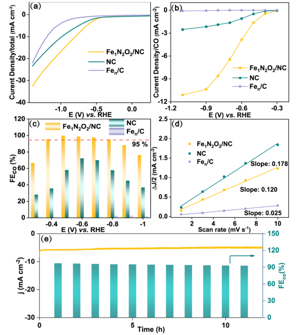 在CO2饱和的0.1 M KHCO3溶液中评估了催化剂的电化学CO2还原性能。从LSV曲线可以看出,与NC和Fen/C相比,Fe1N2O2/NC在-300 mV时对可逆氢电极(RHE)的起始电位更小,在测量电位范围内的电流密度更高。在典型的三电极H型电池中进一步进行了不同电位下的CO2恒电位电解。在-0.7 V时,Fe1N2O2/NC的jCO高达6.5 mA cm-2,远高于相同电位下的对比样品 (NC为1.5 mA cm-2, Fen/C几乎为0 mA cm-2)。Fe1N2O2/NC电催化剂在- 0.4 ~ - 0.8 V的极宽电位范围内,FECO >的选择性高达95%,值得指出的是,在- 0.5 V时,FECO高达99.7%,优于目前大多数报道的Fe单原子催化剂。在-0.7V电位下电解12h,CO法拉第效率和偏电流密度衰减可以忽略不计,展示出优异的稳定性。