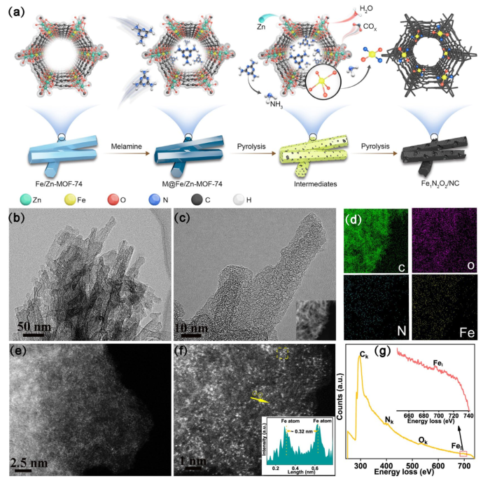 该工作选用Fe掺杂的Zn-MOF-74作为前体进行合成调控。Fe占据原MOF中的Zn位点,与有机配体中的O原子进行配位,进一步引入N源,在高温煅烧条件下,Zn挥发,Fe-O配位团簇会被部分Fe-N配位取代,最终得到具有特殊配位结构的Fe1N2O2/NC 催化剂。通过TEM、HRTEM 表征结果能够观察到Fe1N2O2/NC良好的棒状形貌。EDS mapping 图像证明了催化剂中Fe,N,O,C的均匀分布,HAADF-STEM得到的EELS点谱进一步有力证明了在Fe1N2O2/NC中,Fe、O、N的共存,表明单个铁被C内部的N和O共同锚定。HAADF-STEM图像上孤立的亮点表明Fe单原子的高度分散。