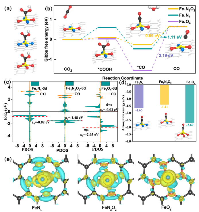 计算表明,与其他模型相比,Fe1N2O2构型最有助于CO的解吸,Fe1N4中的Fe位更容易吸附CO,从而不利于CO解吸。CO@Fe1O4的PDOS出现了明显的自旋极化现象,因此CO分子会被牢牢地困在催化剂表面,从而增加了CO解吸的难度。电荷密度结果显示,Fe1O4由于自旋极化较强,电子流失较少,大部分电子集中在CO上,导致吸附较强,CO解吸困难。此外,与其他模型相比,CO@Fe1N2O2和Fe1N2O2之间的Fe位点Bader变化差异最大,进一步说明CO@Fe1N2O2比其他模型更容易释放吸附后的CO,从而提升反应性能。