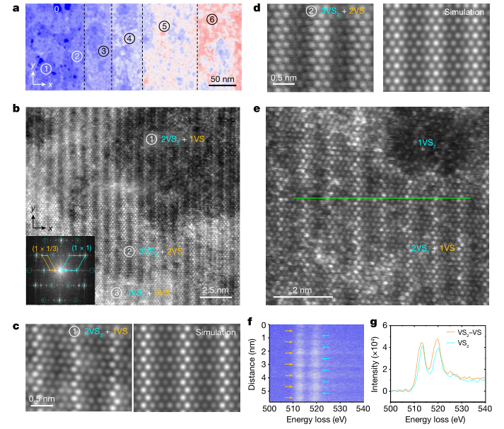 图3 VS2-VS超晶格的原子结构。a, 超晶格的彩色低倍ADF图。b,超晶格最薄区域原子分辨率ADF图。c, d, 放大的超晶格ADF图及相应模拟图。e, 2VS2 + 1VS的ADF图,其中有区域暴露出单层VS2。 f,EELS 2D光谱图,取沿e图中绿色的线扫描。橙色和青色箭头分别指向VS2 + VS和VS2。g, VS2 + VS(橙色光谱)和VS2(青色光谱)钒 L 边缘的 EELS 光谱。