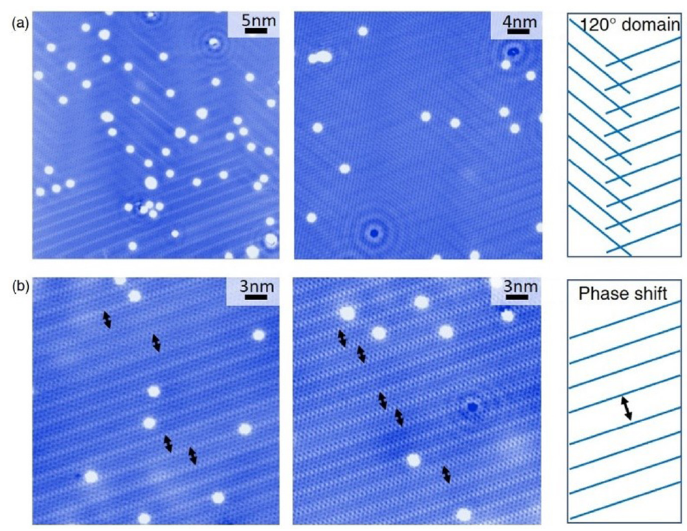 高质量单晶样品的获得是开展相关实验研究的前提,李永恺博士生在王秩伟研究员指导下,经过一系列晶体生长参数调控和优化后,得到了高质量的CsV3Sb5单晶样品,单晶衍射峰的半高宽只有0.07°。电输运和磁性测试表明该材料在91K附近存在CDW相变,在3K附近发生超导转变,同时还观察到明显的反常霍尔信号,如图1所示。进一步与普林斯顿大学M. Z. Hasan团队等人合作,通过低温STM测量发现手性电荷序现象,并观察到了2×2和1×4两种调制结构,如图2所示。其中2×2电荷调制结构跟该体系中的CDW紧密相关,而且由电荷序打开的能隙的振幅表现出实空间调制特性,具有2×2的手性特征,这反应了手性电荷序的电子性质。而1×4调制结构形成不同的畴壁,畴壁之间存在120°的固定夹角,如图3所示。该工作发表在PRB上 [Phys. Rev. B 104, 075148 (2021)],并被选为编辑推荐文章。