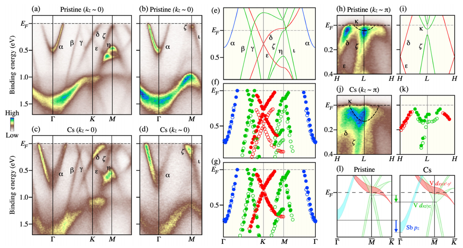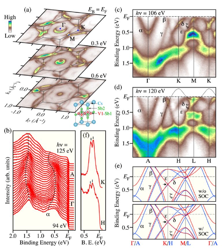 Kagome结构材料中通常会形成平带、鞍点以及具有线性色散关系的狄拉克点,为了对该体系材料的能带结构进行全面而深入的研究,研究团队与日本东北大学的T. Sato课题组一起,利用角分辨光电子能谱(ARPES)研究了CsV3Sb5材料的电子能带结构及其调控。