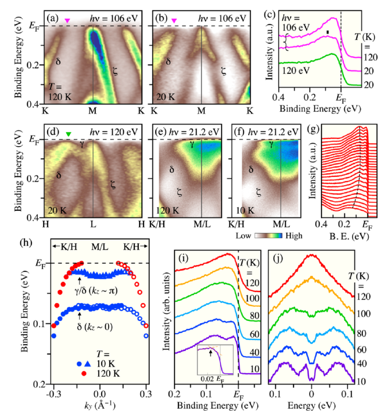 首先在CsV3Sb5母相材料中观察到了鞍点和狄拉克点,如图7所示。进一步,当体系温度降至CDW转变温度以下时,观察到CDW能隙,而且该能隙有很强的费米面和动量依赖特性,如图8所示。相关结果以Letter的形式发表在PRB上[Phys. Rev. B 104, L161112 (2021)]。更进一步,通过在CsV3Sb5材料表面进行原位Cs原子沉积,首次实现了体系的电子掺杂,并由此操控体系的CDW及能带。Cs沉积对该材料的电子掺杂具有轨道选择性,其特征是Sb 5 p z和V 3 d xz/yz能带的电子填充显著增加,而V 3 d xy/x2−y2能带则相对稳定。通过研究M点周围CDW能隙随温度的变化关系,发现Cs修饰可以完全抑制CDW,同时使鞍点保持在费米能级,如图9所示。该结果表明,多轨道效应对CDW的产生起着至关重要的作用,同时由于CDW和超导之间的竞争,这为未来在 A V3Sb5体系中操纵CDW和超导电性提供了可能。相关结果发表在PRX上[Phys. Rev. X 12, 011001 (2022)]。