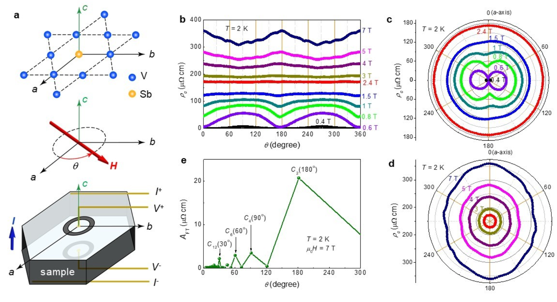 CsV3Sb5材料中CDW的驱动机制及其与超导电性的关系一直是大家关注的焦点,为了研究体系的CDW驱动机制和超导电性,研究团队跟南京大学闻海虎教授课题组展开合作,首先利用红外光谱对CsV3Sb5中的CDW进行了深入研究。发现在 T CDW = 91 K以上,该材料低频的光电导表现出明显的Drude响应,与该材料的金属性相符。在 T CDW以下观察到典型的电荷密度波的光学特征。进一步通过对所有温度的光电导谱进行Drude-Lorentz拟合,如图4所示。发现CDW能隙在M点的鞍点处打开,而Γ点附近的电子带和K点附近的Dirac带均不受影响。该结果表明,M点处的鞍点通过波矢Q的嵌套可能是CsV3Sb5中电荷密度波的驱动机制。该工作以Letter的形式发表在PRB上[Phys. Rev. B 104, L041101 (2021)],并被选为编辑推荐文章。随后,他们对CsV3Sb5在c方向的电阻率进行测量(如图5所示),电流沿着c方向并始终垂直于磁场,磁场平行于ab面并在面内旋转。可以看出不同磁场条件下的电阻率随角度的变化曲线存在明显的二重对称性,破坏了晶体结构的面内六重(或三重)对称性。在外加磁场小于2.4 T(对应超导态)和大于2.4 T(对应正常态),电阻率极小值对应的磁场方向相互垂直,说明超导态和正常态二重对称性相互垂直。进一步研究了这两种二重对称性随温度的变化关系,结果如图6所示。可以看到,低磁场下超导态对应的电阻二重对称性在超导转变温度附近迅速消失,而高磁场下正常态测量到的二重对称性随着温度升高减弱,并在CDW转变温度附近消失,这些结果大大丰富了人们对这一笼目结构超导材料及其物性的认识。相关结果发表在NC上[ Nat. Commun. 12, 6727 (2021)]。