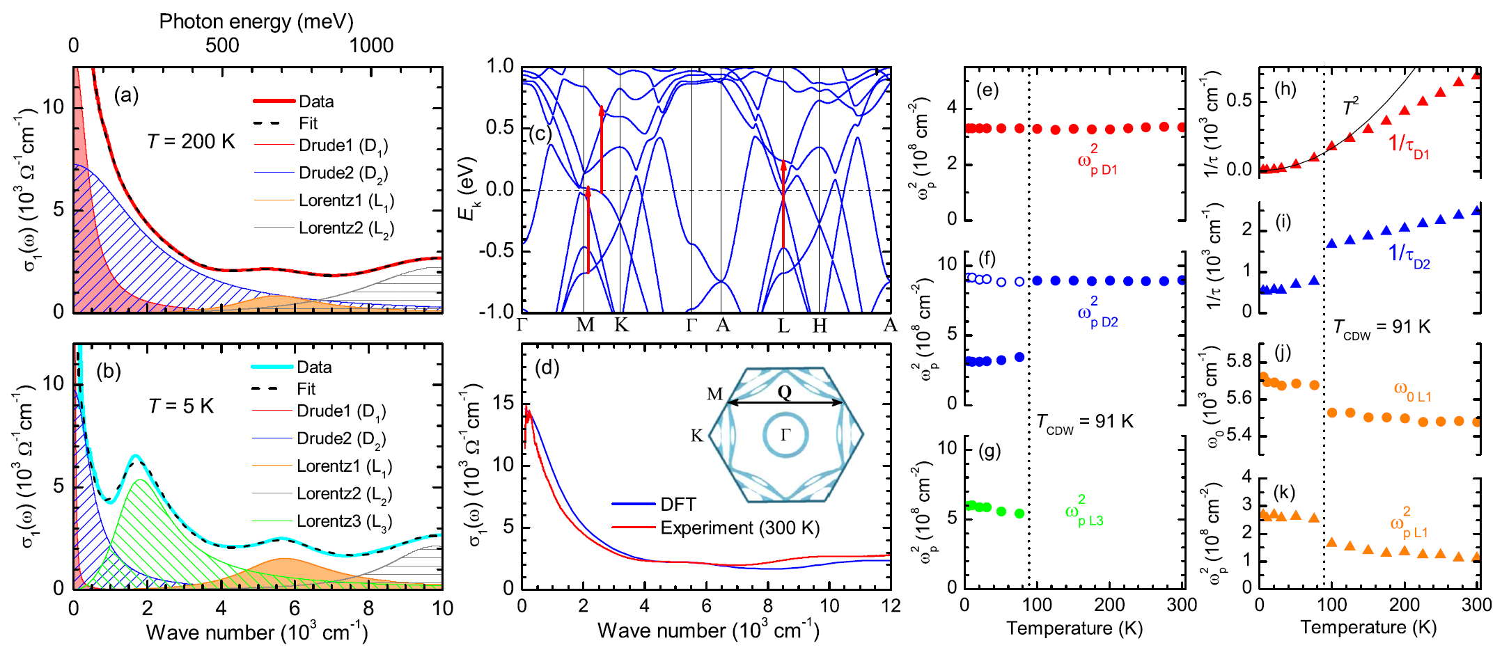 图4 光电导谱的拟合,计算得到的能带结构图,实验与理论的光电导谱对比,以及拟合得到的各种参数的温度依赖