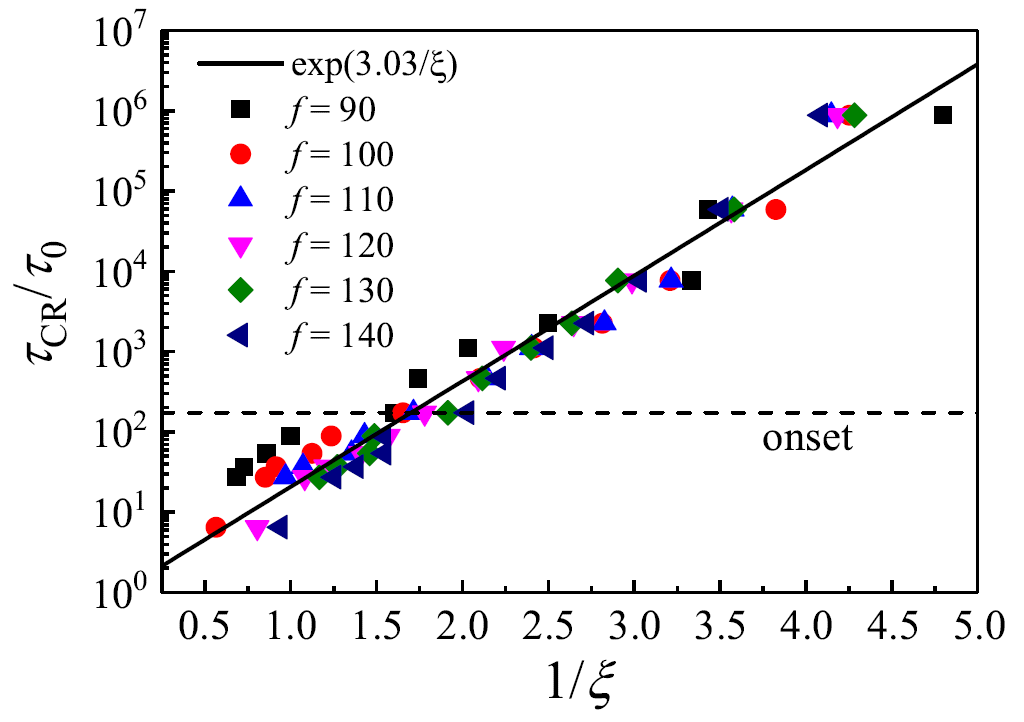 团队设计了新的探测玻璃体系静态结构的手段,具体为,在短时间内,对粒子施加一固定大小,方向随机选取的力,观察撤去力之后,粒子不能回弹的位移,即不可逆位移有多大。图1(a)展示了当对粒子在0.1(约化单位)时间间隔内施加一外力大小为f = 100(约化单位)的力时,粒子平均位移随时间的演化规律。较长时间下,此平均位移趋近一平台值,即黑色虚线标出的不可逆位移L(T, f),显然,温度越低,不可逆位移L(T, f)越小。近一步的研究发现,L(T, f)正比于 T - T 0 (图1 (b)),其中 T 0为Vogel–Fulcher–Tammann (VFT) 方程预测的非晶体系的理想玻璃化转变点,因此,L(T, f)在理想玻璃化转变点外推为0。进一步分离变量,我们可得到L(T, f) = ξ(T)A(f), 其中塑性长度ξ(T)∝( T - T 0 ), A(f) ∝( f - f 0)。塑性长度ξ(T)与体系弛豫时间存在指数依赖关系(图2),因此建立了塑性长度与非晶体系慢动力学的联系。