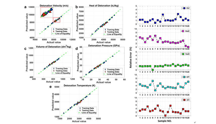 同时研究中发现在羽流膨胀和等离子体冷却过程中,振动态玻尔兹曼分布对应温度并非一直降低,而是在特定时间延迟下短暂恒定,如图3所示。这是由于含能材料放热物理化学反应放出的额外热量补偿了等离子体温度的持续衰变。因此,以特定延时下采集的高速动态图像作为输入数据,结合特征提取和线性SVR算法,建立了基于时间分辨图像及光谱的含能材料五爆参数(爆速、爆热、爆容、爆压、爆温)定量分析的机器学习模型,进而完成了27种含能材料的爆轰性能高精度预测,预测模型的平均预测误差均小于5%,如图4所示。该工作为含能材料爆轰性能的快速测试提供了一种低成本、高精度、高安全性、高通量的新原理、新方法、新思路,相比于高成本、高风险、低重复精度的传统宏观测试方法,优势显著。该成果发表在国际权威期刊J Materials Chemistry A( 2022,10,13114-13123)上。