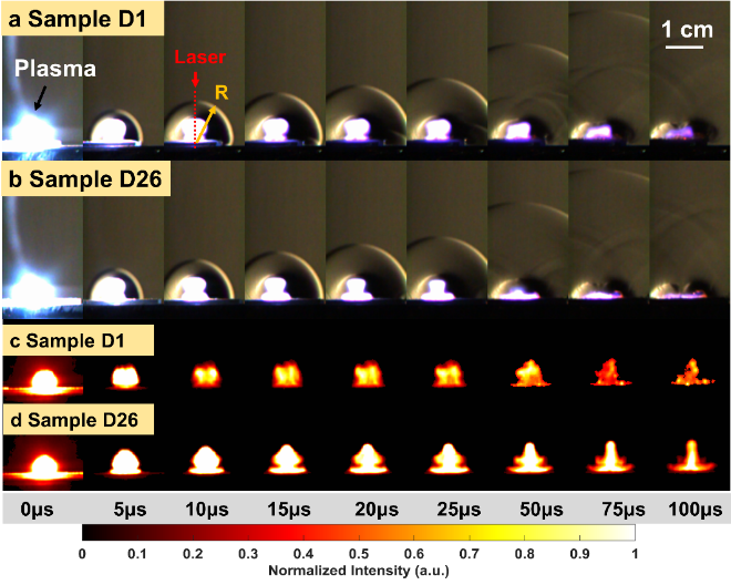 图2 高速流场演化图像:(b)激光诱导冲击波演化图像;(c)激光诱导等离子体演化图像