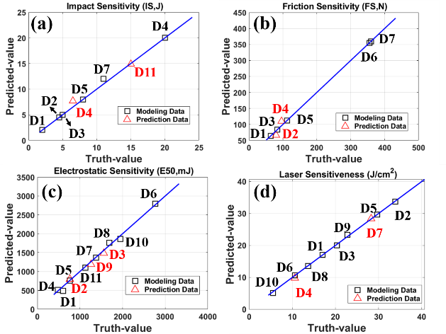 图6 基于PCA-PLS的预测模型:(a)冲击感度、(b)摩擦感度、(c)静电感度和(d)激光感度