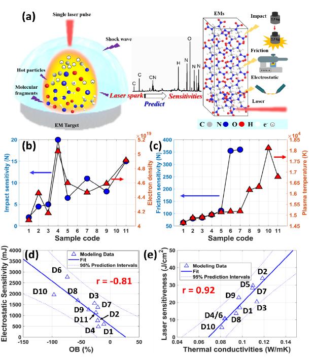 将脉冲激光聚焦到样品表面微米级范围内,焦点处产生激光等离子体,为含能材料的分解提供了一个局部高温高压环境。在高温等离子体火花中,伴随着强烈的放热化学反应,原子、离子、电子、分子碎片和一些自由基等相互碰撞,如图2(a)所示。化学反应释放能量需要电子参与,从而极大的影响了电子的冷却和复合过程。不同分子和晶体类型的含能材料的解离程度和解离速率都与感度有关,等离子体温度和电子密度都可以由谱线强度给出。研究表明,电子密度和撞击感度、等离子体温度和摩擦感度具有一定的关联性(如图5(b-c))。因此可以通过激光诱导等离子体的有效总辐射谱来评价含能材料的感度,结合等离子体特征光谱和统计学算法,可以很好地建立撞击、摩擦、静电和激光等感度预测模型,预测模型平均相对误差低于10%。该成果作为封底文章发表在原子光谱分析领域最高水平的学术期刊Journal of Analytical Atomic Spectrometry(2021, 36, 2603)上。